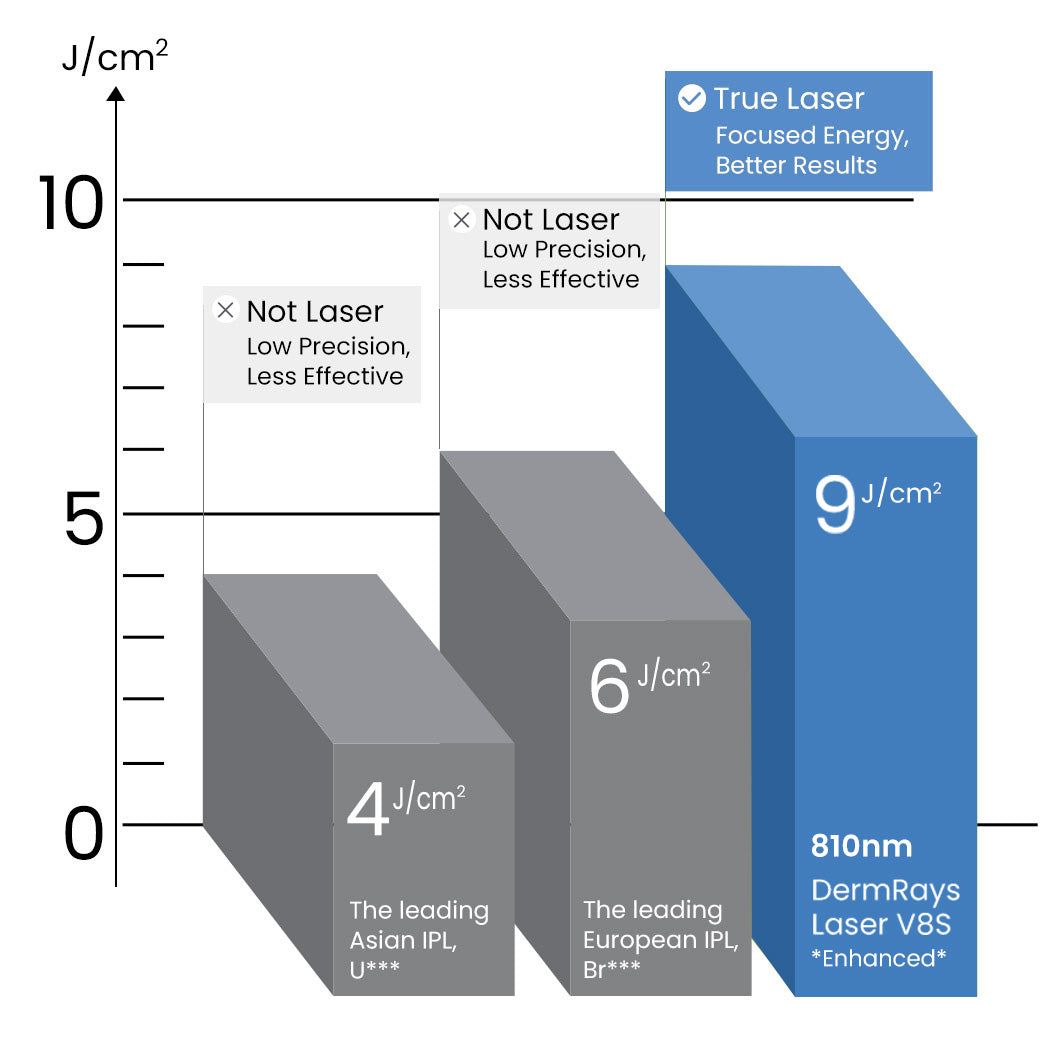 Not all hair removal devices are created equal. Delivering up to 9 J/cm² per pulse, the V8S *Enhanced* combines superior energy with precise laser technology for more effective hair removal than any IPL device.