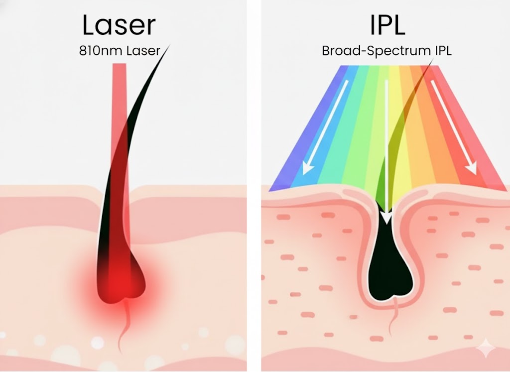 Similarly based on photothermal effect, IPL hair removal uses broad-spectrum light with multiple wavelengths. Unlike laser, IPL light is not focused but can be absorbed by melanin on the skin surface and in the hair follicles, causing thermal damage and preventing hair growth.