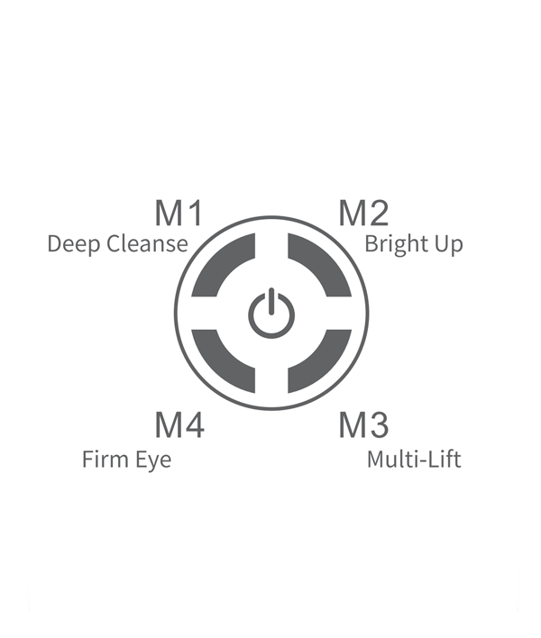 Our device has 4 modes: M1 Deep Cleanse, M2 Bright Up, M3 Multi-Lift, and M4 Firm Eye.